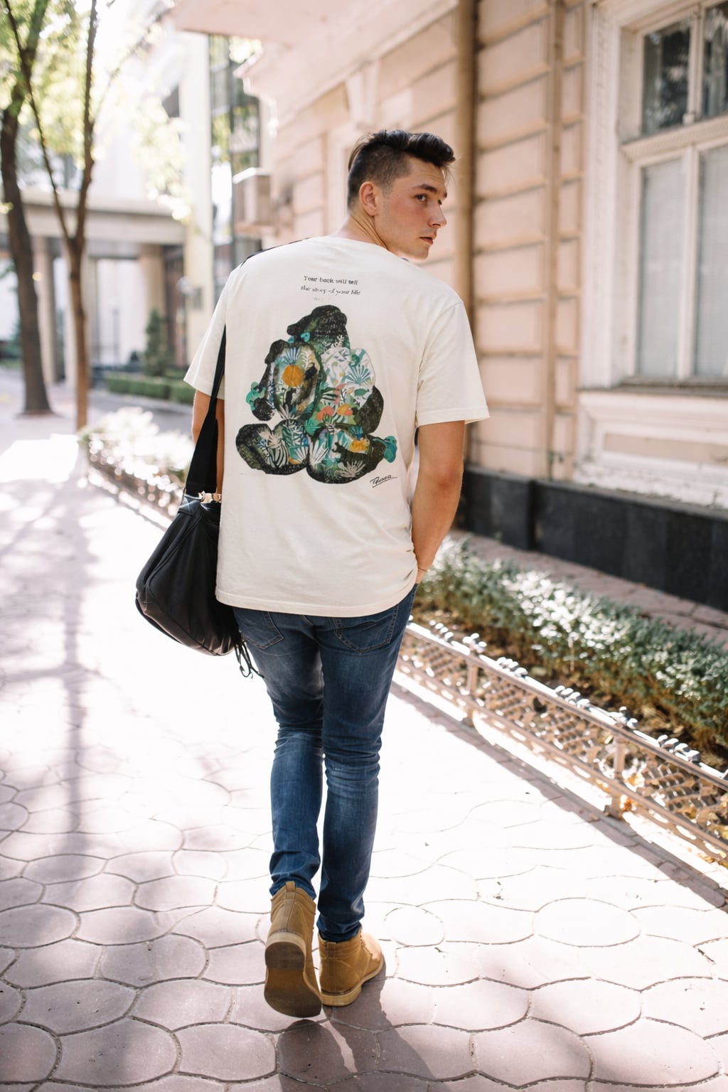 色彩豊かな森が描かれたゴリラの背中が、圧倒的な存在感を持つ一枚です。このユニークでインパクトのあるデザインは、どんな場面でも注目を集めること間違いなし。モダンなアートのようなビジュアルが、カジュアルなスタイルから特別なシーンまで幅広くフィットします。